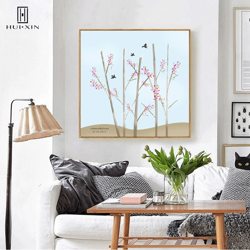 Beautiful Natural Spring View Pink Flowers Flying Birds Special Wall Decor DIY Fingerprint Guestboo